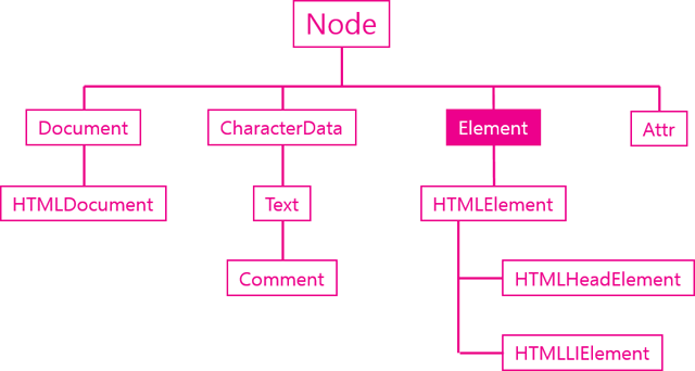 - HTML이나 XML, SVG, XUL과 같이 마크업 형태의 언어를 제어하기 위한 규격이기 때문에 Element는 마크업 언어의 일반적인 규격에 대한 속성을 정의하고 있고, 각각의 구체적인 언어(HTML,XML,SVG)를 위한 기능은 HTMLElement, SVGElement, XULElement와 같은 객체를 통해서 추가해서 사용하고 있다.