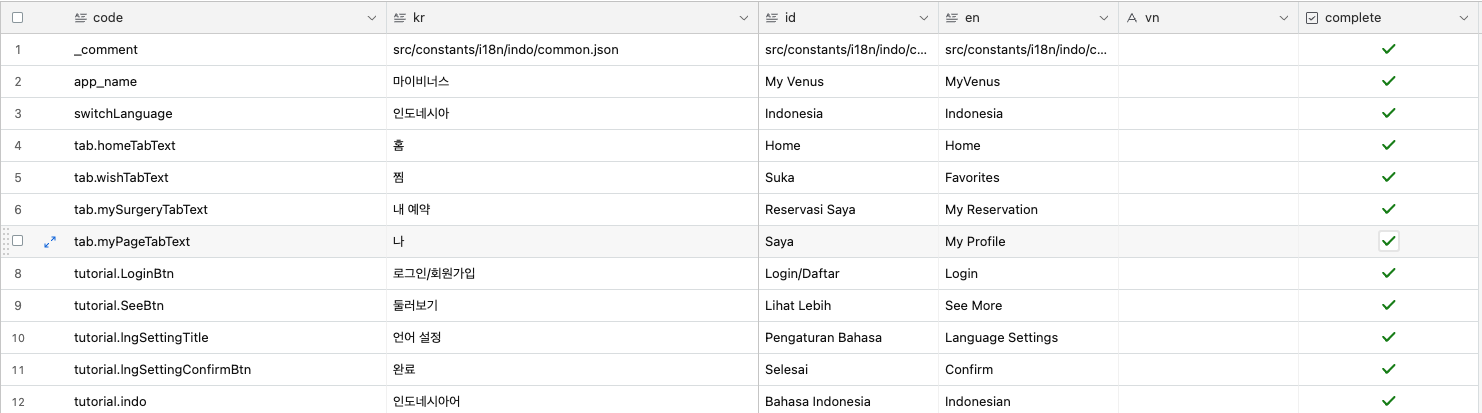 운영팀에서 번역이 완료되었다는 소식을 알게 되면 바로 로컬 개발 프로젝트 내의 스크립트에 지정해 둔 명령어를 실행하여 Airtable에서 최신 DB 데이터를 가져온 데이터를 가공 및 파싱 하여 i18next의 언어 텍스트 파일(id.json... 등등)의 객체 데이터에 업데이트되어 최신 적용하도록 합니다.