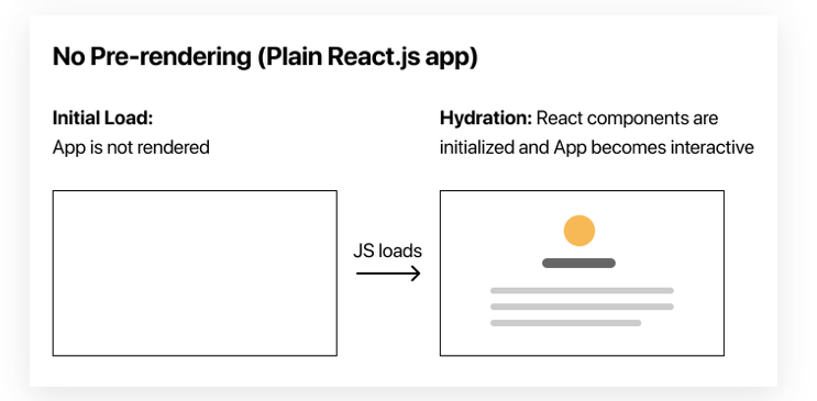 하지만 No Pre-rendering 방식은 빈 HTML 파일을 최초에 먼저 렌더링 한 이후에 스크립트를 로딩하는 방식으로 처리가 됩니다.