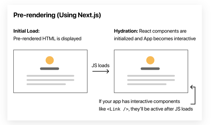 NextJs는 초기 페이지를 서버에서 자바스크립트까지 로딩을 하는 방식으로 <Pre-rendering>을 이용합니다. Pre-rendering 방식은 서버에서 자바스크립트로 HTML 컨텐츠를 채운 완성된 파일을 클라이언트에게 전달하여 처리가 됩니다.