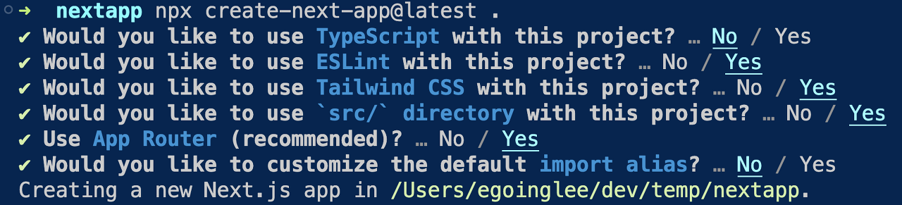 타입스크립트 사용 유무, App Router 사용 유무 등등 많은 설정들이 있으니 참고 바랍니다.