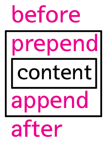 Adds the specified class(es) to each element in the set of matched elements. Insert content, specified by the parameter, after each element in the set of matched elements. Insert content, specified by the parameter, to the end of each element in the set of