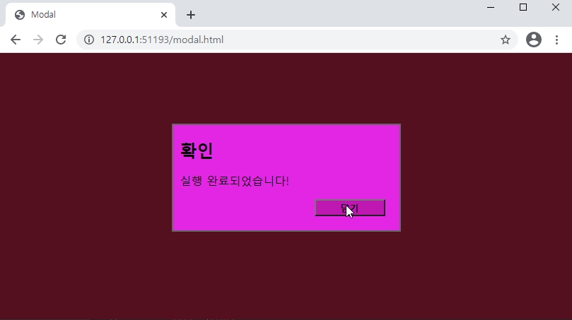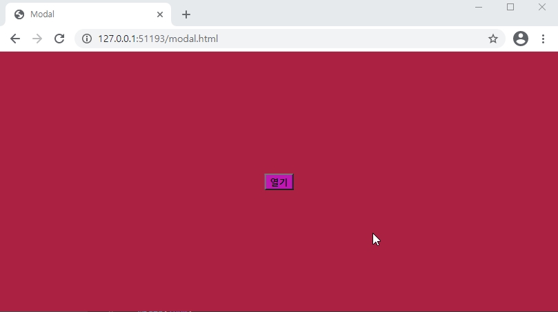 간단한 자바스크립 코드를 이용하여 열기 버튼을 클릭하면 모달창이 등장하고 닫기 버튼을 누르면 다시 모달창이 꺼지는 페이지를 구성해보았다.