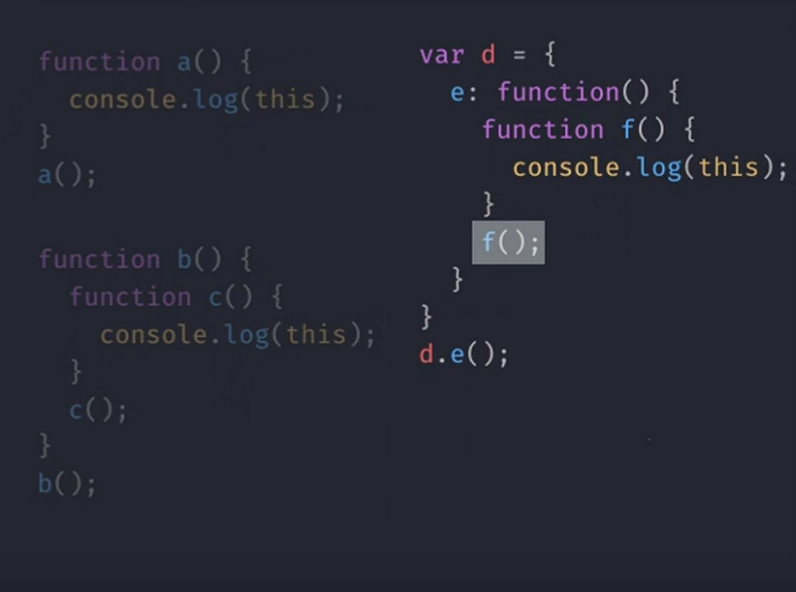 - 위의 코드 예시를 보면 왼쪽 코드는 a.b 중 b가 메소드인데 b '점' 앞에 있는 a가 this라고 볼 수 있다. 즉 a변수이며 b객체를 가르키므로 메소드 함수의 this는 b 객체 자체라고 볼 수 있다.
