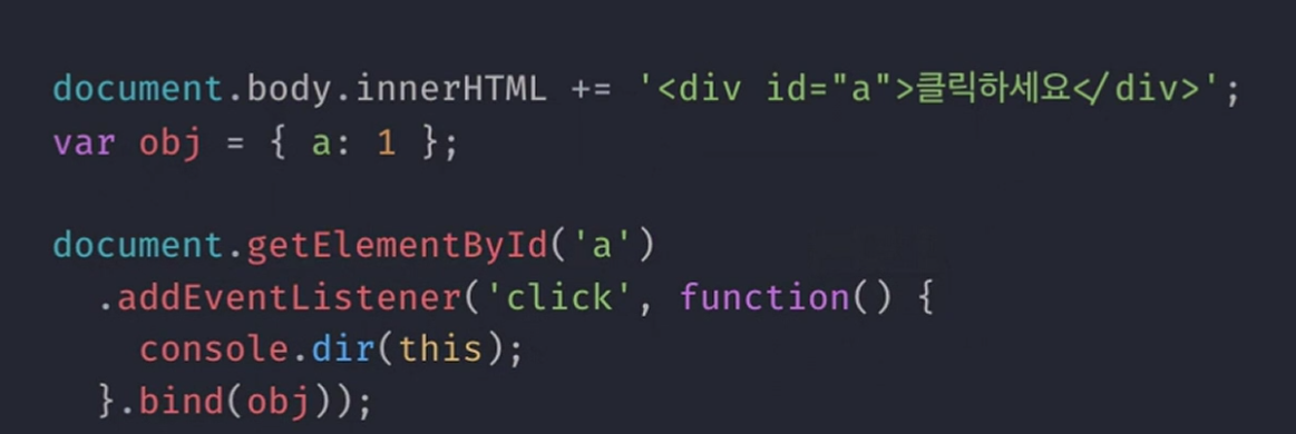 - 만약 addEvevtListener자체가 설정한대로 따르기 싫다면 마찬가지로 bind을 이용하여 원하는 대로 this를 결정되게 할 수 있다. 오른쪽 코드에서 bind(obj)을 적용한 모습을 볼 수있다. 오른쪽 코드의 this는 obj 객체로 결정되었다.