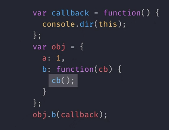 - 위의 코드를 보면 callback함수의 예시인데 callback 함수가 obj.b의 인자로 들어가 있어 this가 결정된 것은 obj 변수 안에 있는 b의 객체의 메소드 함수를 호출시키는 것이다. 즉 callback 함수=cb() 이다. 이때 호출될 cb()가 홀로 있기 때문에 전역객체의 메소드이며 this는 결국 window가 뜰 수 밖에 없다.