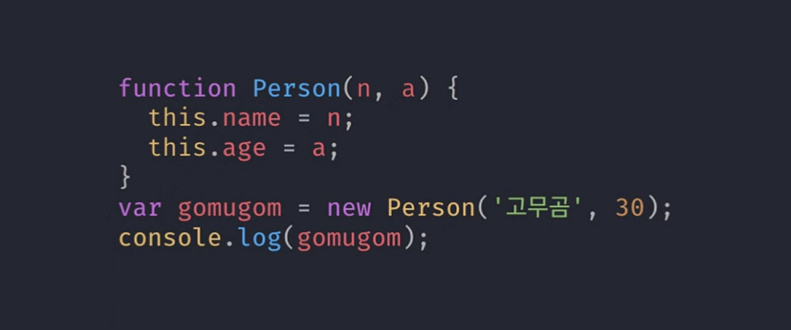 - 만약 person 함수를 new을 이용하지 않고 생성하지 않았다면 this은 전역객체인 window을 가르키겠지만 new을 이용하여 person 생성 함수를 따로 만들었으면 자동으로 Person의 this는 새로운 person 생성 함수의 변수인 gomugom 객체 자체가 된다.