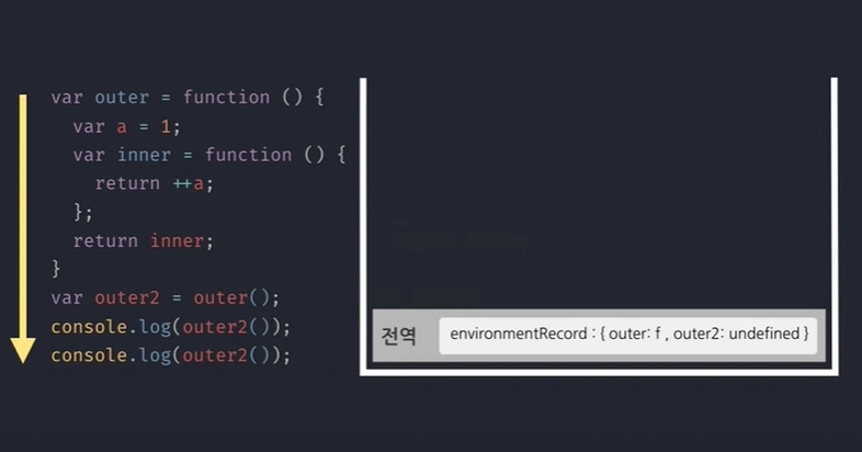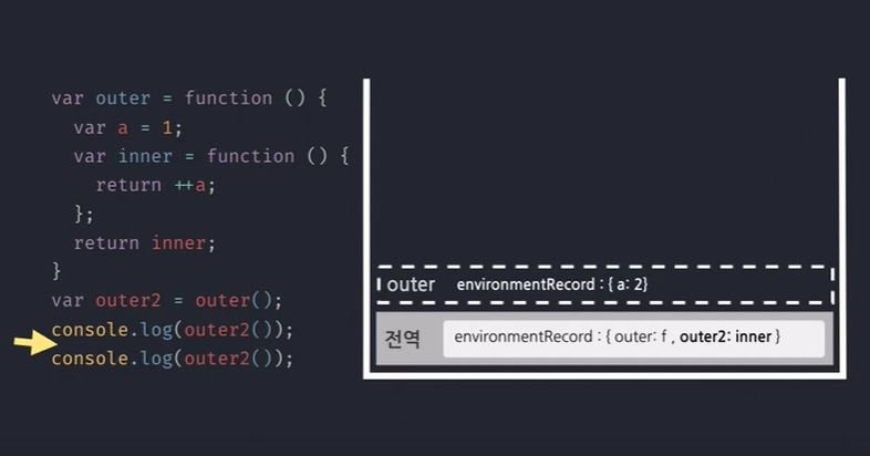 1. 처음에는 전역이 실행되고 outer는 함수가 담기고 outer2는 아직 정의되지 않았다.