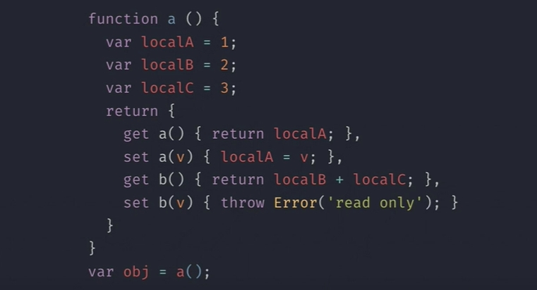 - 여기서 중요한 것은 obj 변수가 get, set이 있어 값을 바꿀 수도 있고 읽어올 수 있지만 obj 자체가 지역변수 localA에 직접 접근하는 것은 아니다라는 것이다.