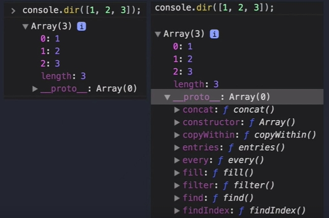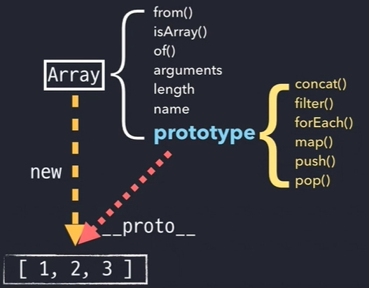 - 만약 Array 생성자가 새로운 생성 객체 배열[1,2,3]을 만들었다면 생성자에는 __proto__ 이 있는데 이 안에는 새롭게 생성한 객체 배열인 Array()을 비롯하여 많은 메소드들이 들어있다.