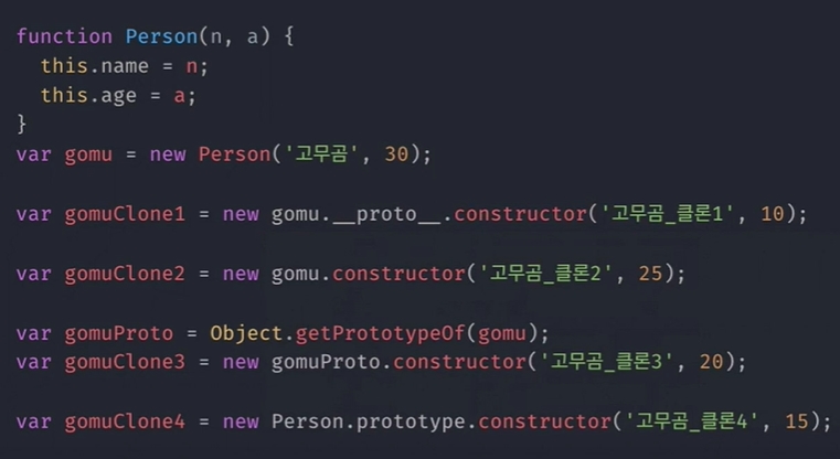 - 위의 코드 중 var로 선언한 모든 변수가 똑같이 새로운 생성자를 만들어낸 생성자 Person를 바라본다.