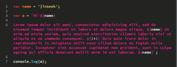 - 위의 코드를 보면 3행의 줄을 한 칸 뛰어 쓴다고 실제 도출되는 결과가 칸이 뛰어지지 않는다. 하지만 Template Literal 이라는 기능을 사용하면 더 쉽게 칸을 뛰어 쓸 수 있고 문자 또한 치환하기 쉬워진다.