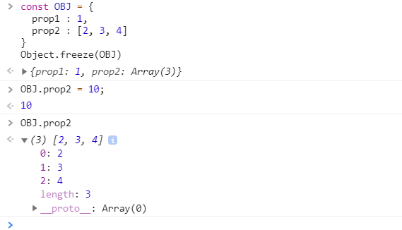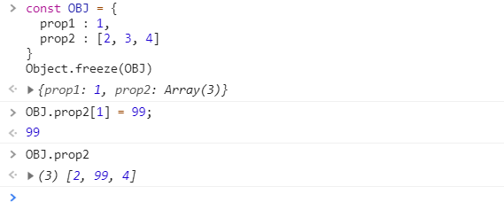 - 얼리기 위해서는 object.freeze(OBJ.prop2) 처럼 다시 얼려줘야 한다. 이 과정을 Deep Freezing 이라 한다.