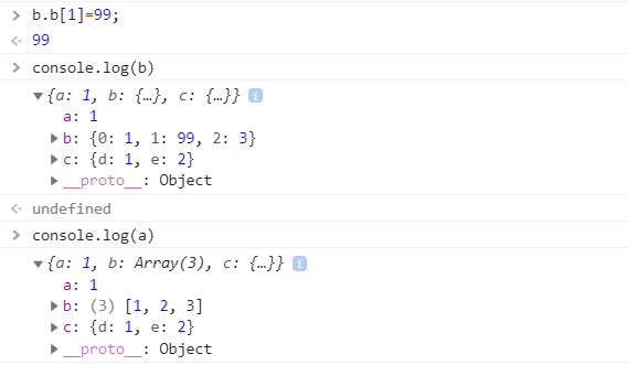 아래 결과를 보면 a변수를 복사한 것을 담은 b의 1번 배열의 값을 바꾸더니 바뀌어버린다. 즉 같은 배열을 참조하고 있을 뿐이다.