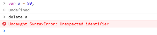 또 전역 객체 var는 한 번 선언하면 삭제하지 못하고 에러가 뜨기까지 한다. 전역변수가 된 동시에 전역객체의 프로퍼티가 되버리기 때문에 함부러 삭제할 수가 없다.