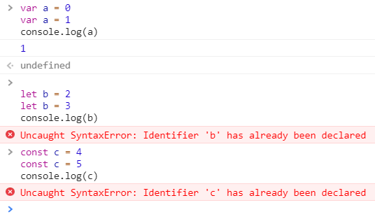 - 옛 버전인 var는 중복이 되도 마지막 var로 인식이 잘되었지만 let, const부터는 중복된 변수가 있다면 아예 실행이 되지 않는다는 것을 확인할 수 있다.