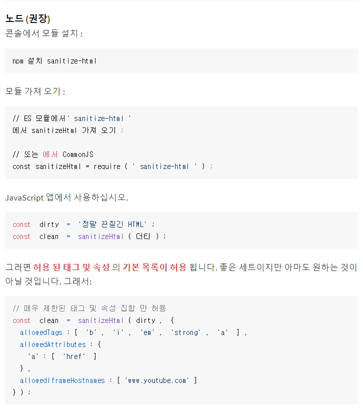//sanitizeHtml 변수 메소드의 두 번째 인자는 태그 중에 허용할 수 있는 태그를 설정할 수 있다.