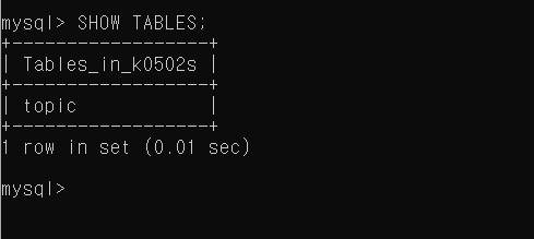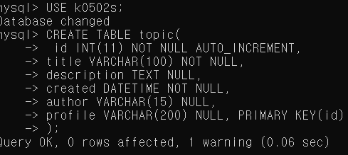 mysql> CREATE TABLE topic( //topic이라는 이름으로 테이블 생성 시작