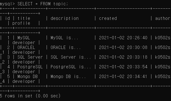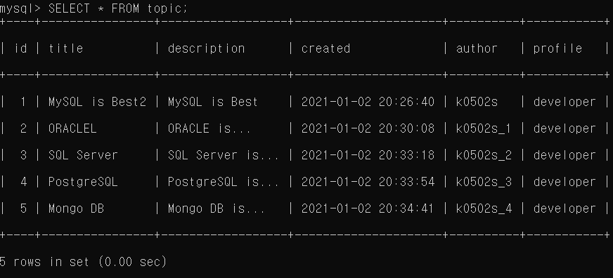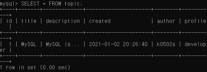 INSERT을 실행 한 후 이름이 topic인 데이터 표를 SELECT * FROM topic이라는 명령어로 확인할 수 있었다.