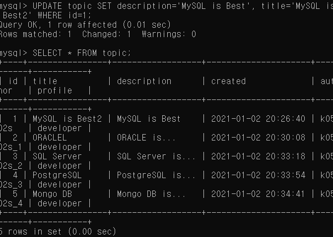 UPDATE topic SET description='MySQL is Best', title='MySQL is Best2' WHERE id=1;