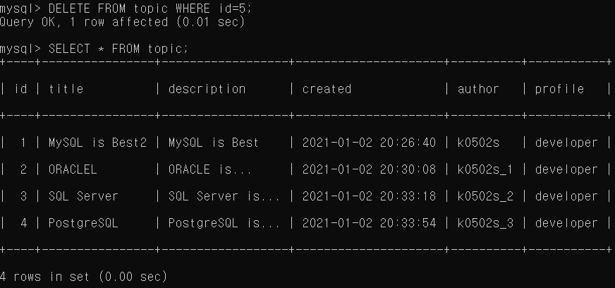 id 값이 5번인 행이 완전히 사라진 것을 확인 할 수 있다.