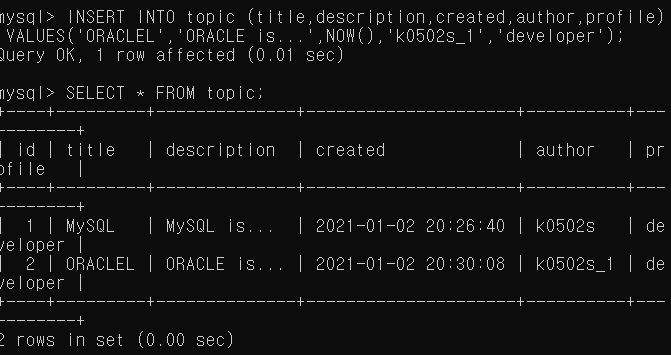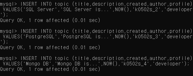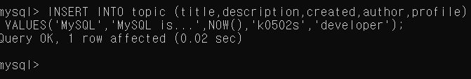 INSERT INTO topic (title,description,created,author,profile) VALUES('ORACLEL','ORACLE is...',