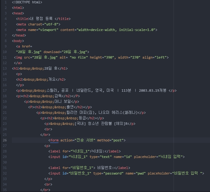 input 태그를 이용하여 로그인 정보를 적을 수 있는 아이디와 비밀번호 칸을 만들었고 textarea 태그를 이용하여 문장으로 된 영화에 대한 감상평을 적을 수 있는 넓은 칸을 구현하였습니다.
