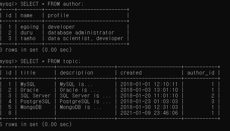 topic 테이블의 데이터와 author 테이블의 데이터를 한 곳에 적용시킬 수 있다는 것을 확인 할 수 있다.