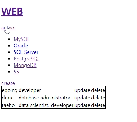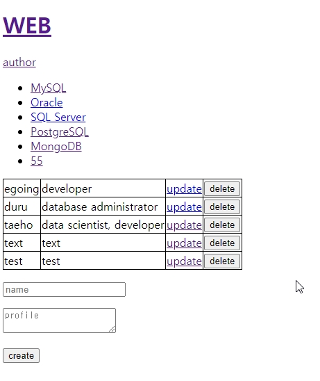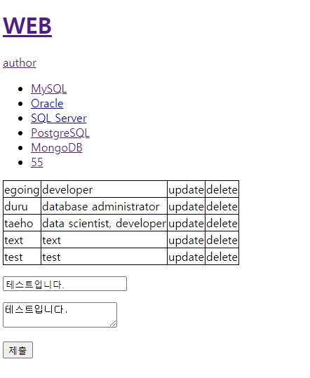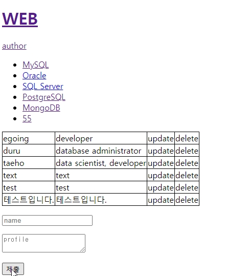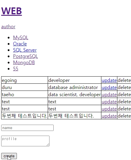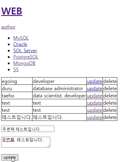 update 링크를 클릭하면 그대로 데이터 표으 데이터가 들어있는 폼이 등장하고 update 버튼을 누르면 바로 데이터 표에 수정된 모습을 확인 할 수 있었다.