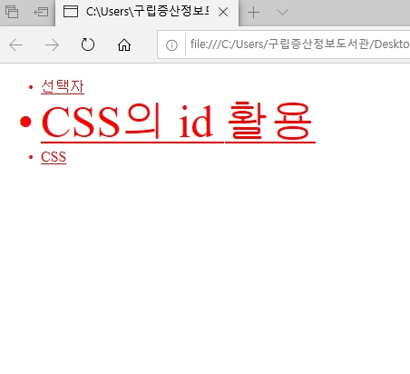 html 텍스트에 CSS을 적용할 때 여러개의 공통된 selector 중 특정 하나만 하고 싶다면 id 기능을 적용하면 id을 적용한 html 텍스트만이 효과가 적용된 것을 확인할 수 있다.