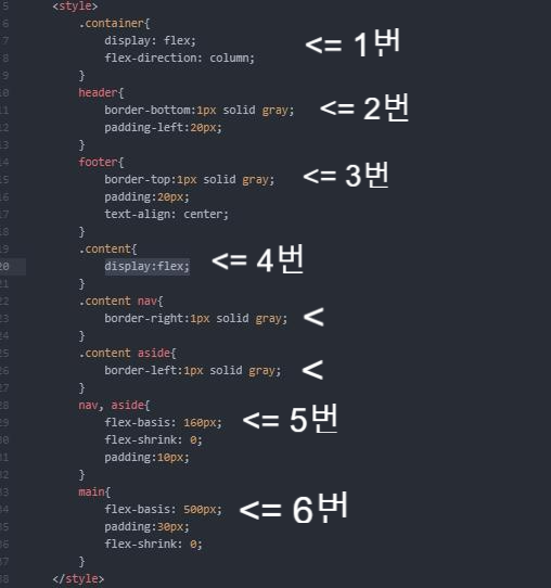 5. nav, aside을 선택자로 설정하여 nav, aside 요소에 flex-basic로 크기를 설정하고 flex-shrink: 0;로 창이 줄어들어도 영역이 줄어들지 않게 설정하였습니다. padding로는 깔끔하게 보이도록 간격 비율을 맞추었습니다.