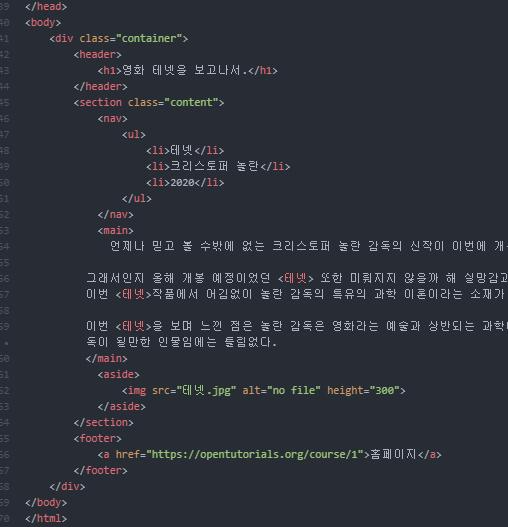 4. section 부분에 선언한 content에 display: flex 속성을 부여하여 기본 설정인 row 효과를 적용하여 section에 포함된 모든 요소들이 열 방향으로 설정되게 하였습니다. 추가로 section 안의 있는 자식 nav, aside에 border을 통해 경계선을 적용하였습니다.