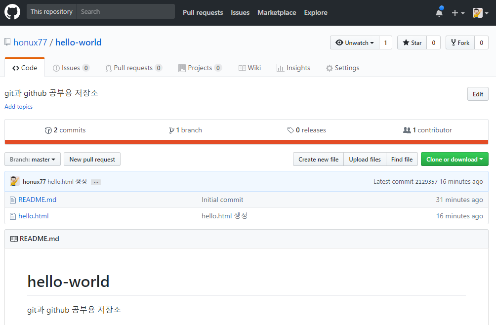만들고 나면 여러분의 첫번째 저장소가 생긴다. 이 저장소의 주소를 메모장 등에 저장해 놓는게 좋다.