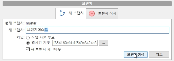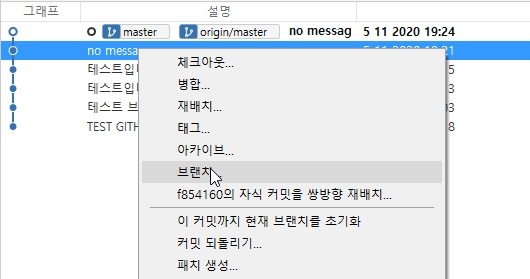 - 이때 다시 수정하기 전의 프로젝트로 돌아가고 싶은 구간을 선택하여 마우스 오른쪽 버튼을 눌러 바로가기에서 브렌치를 클릭하면 브렌치 생성 창이 등장한다.