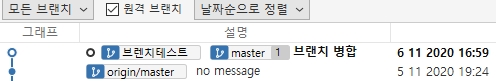 - 브랜치를 보면 브렌치 병합의 내용으로 커밋된 정보를 확인할 수 있다.
