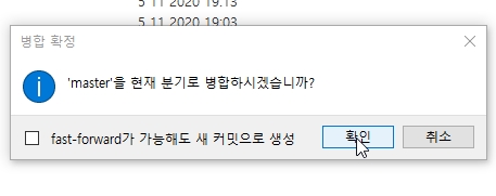 - 그리고 현재 환경에서 방금전에 수정했던 master 환경을 마우스 우클릭하여 ("바로가기=>병합") 병합을 실행하여 준다.
