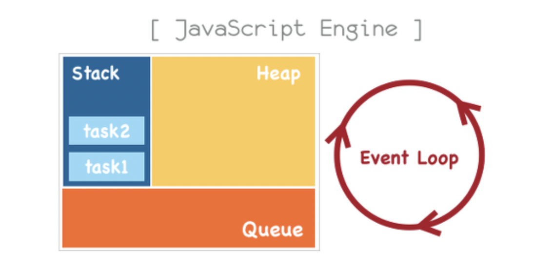 - 자바스크립트 엔진은 두 가지 구성요소로 구성됩니다. 하나는 Memory Heap(메모리 힙)이고, 다른 하나는 Call Stack(호출 스택)입니다. Memory Heap(메모리 힙)은 메모리 할당이 발생하고, Call Stack(호출 스택)은 코드 실행에 따라 스택이 하나씩 쌓이는 곳입니다.