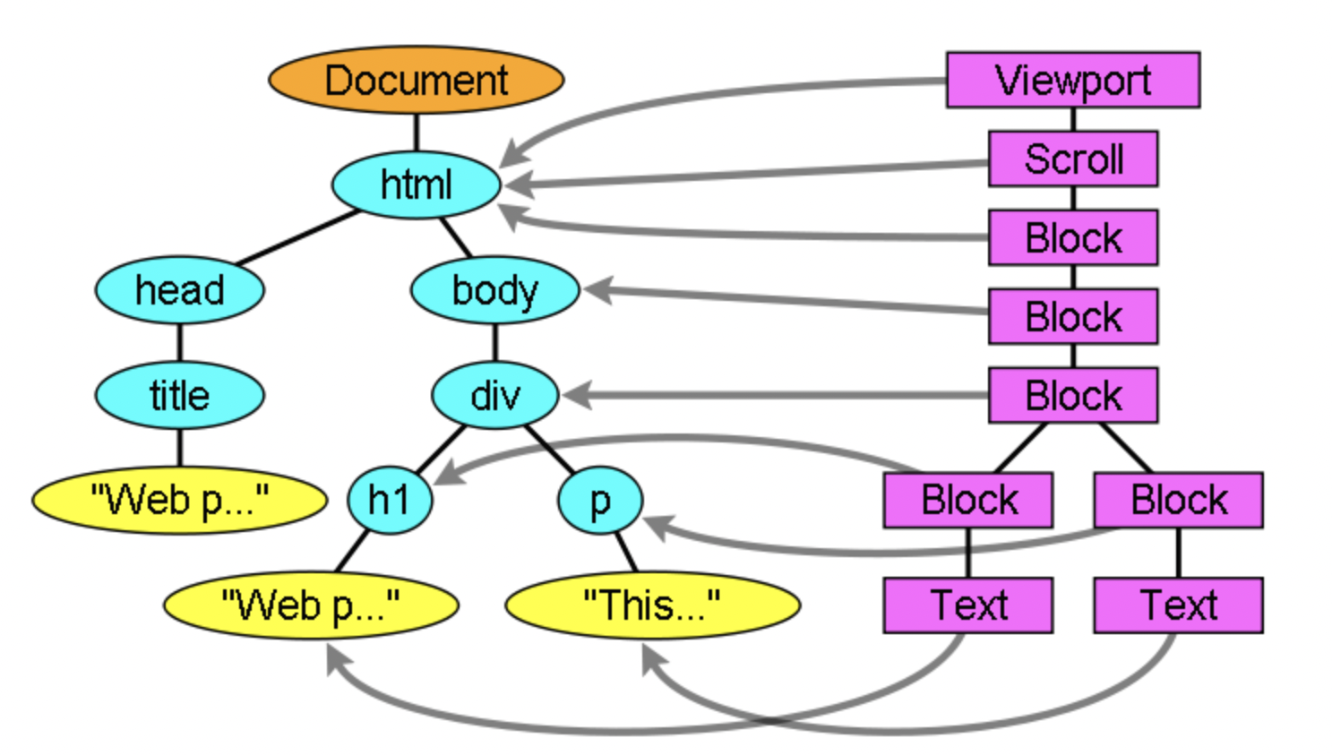- DOM 트리(DOM Tree)가 웹 상에 나타날 내용(Contents)를 구성한다면 렌더 트리(Render Tree)는 시각적 요소, 어떻게 나타날지 그 스타일을 지정하는데 렌더 트리는 색상, 차원 등 시각적 지침들을 담은 정사각형들로 구성되고 그 정사각형들은 스크린에 맞는 순서대로 정렬하게 됩니다.