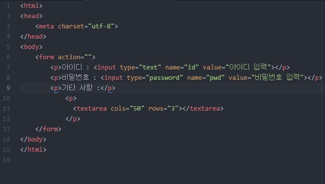 - rows="행수"(필수 속성) : textarea에 표시될 줄 수를 지정합니다.