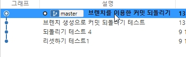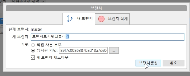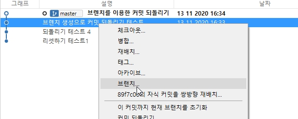 다시 처음에 커밋했던 곳으로 되돌리기 위하여 되돌리고 싶은 커밋에 바로가기 메뉴에서 브렌치를 클릭하여 생성한다.
